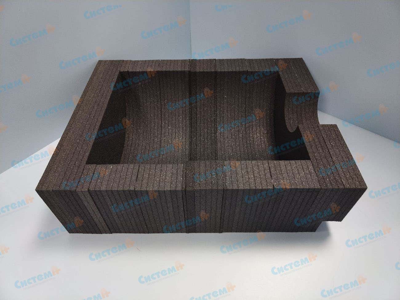 В требованиях технического задания клиенты указали сшитый пенополиэтилен. Это прочный вспененный полимер с высокой амортизацией, отличными защитными свойствами. Прочный, долговечный, надежный материал применяется для хранения и транспортировки чувствительного к тряске оборудования.